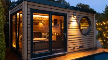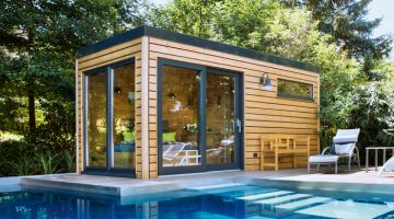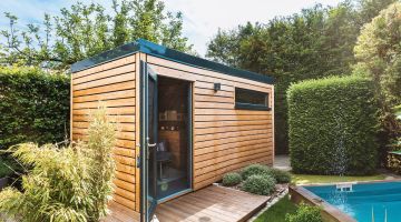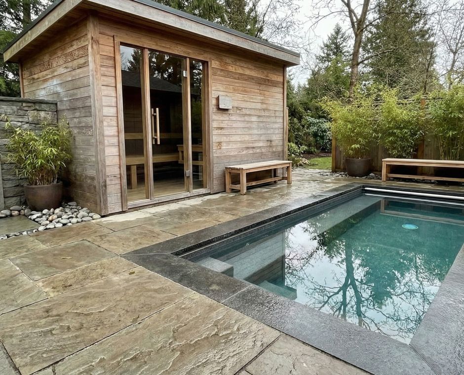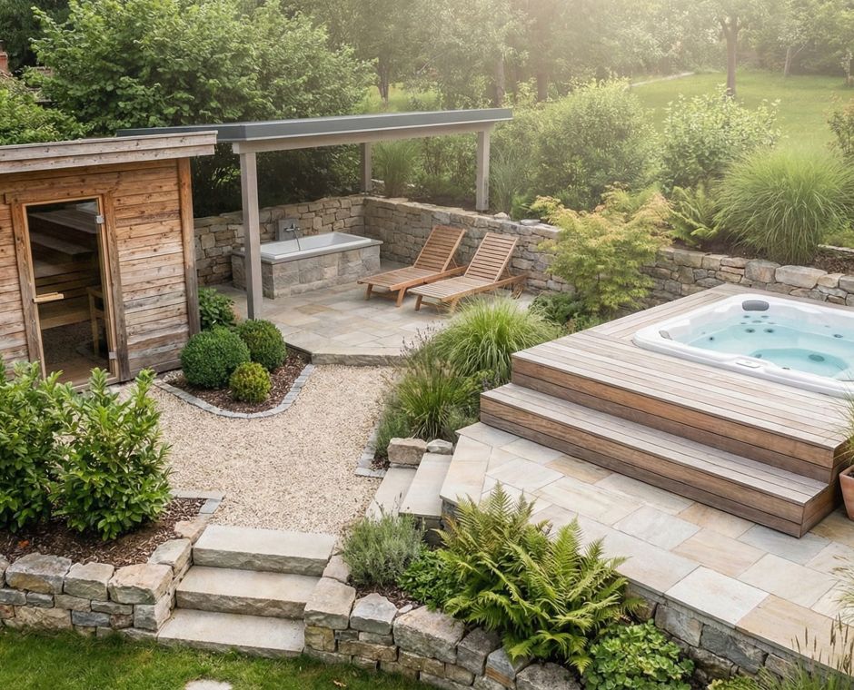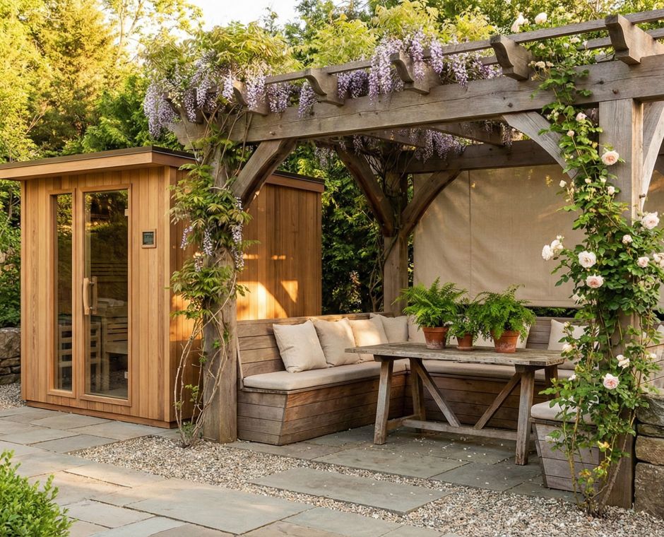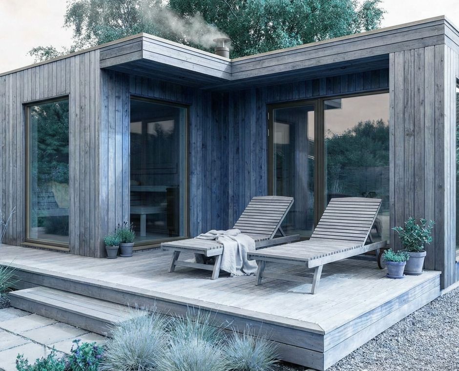 Ein Holzdeck vor der Sauna schafft Platz zum Abkühlen, Sitzen oder Liegen und wird schnell zum meistgenutzten Bereich. Besonders sinnvoll ist ein leicht erhöhtes Deck, da es Nässe vom Boden fernhält und barfuß angenehmer ist. Gleichzeitig entsteht ein klar definierter Übergang zwischen Sauna und Garten, der Ordnung und Ruhe vermittelt.